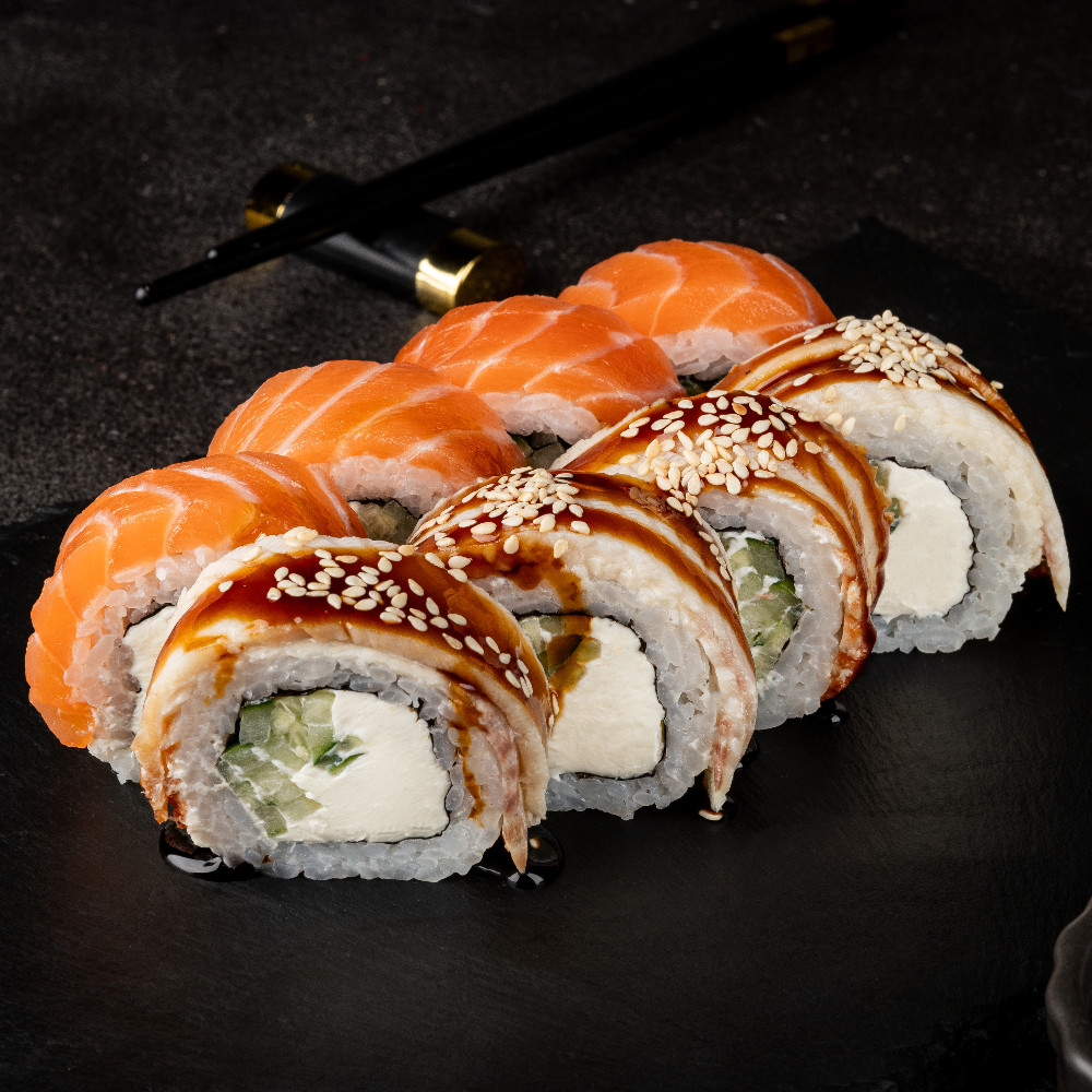340 г. - 8 шм. - вугор, лосось, вершковий крем-сир, огірок, рис, норі, с-с унагі, кунжут